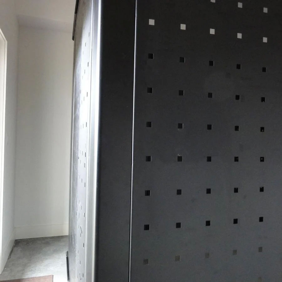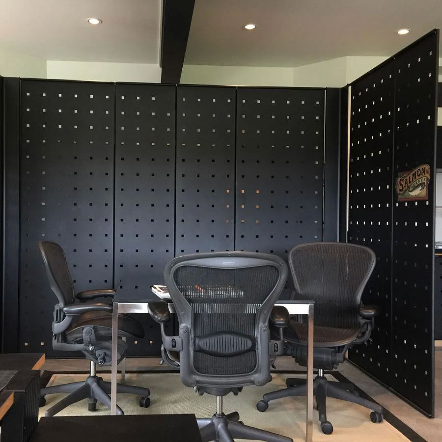 Milano Black metal panels for freestanding or wall display, tradeshow booth, meeting space, showroom display, retail visual background. Can be configured many ways. Very modern, with stamped squares in panels. Sturdy, strong and assembles easily with just an allen wrench. Vintage classic yet timeless in design.